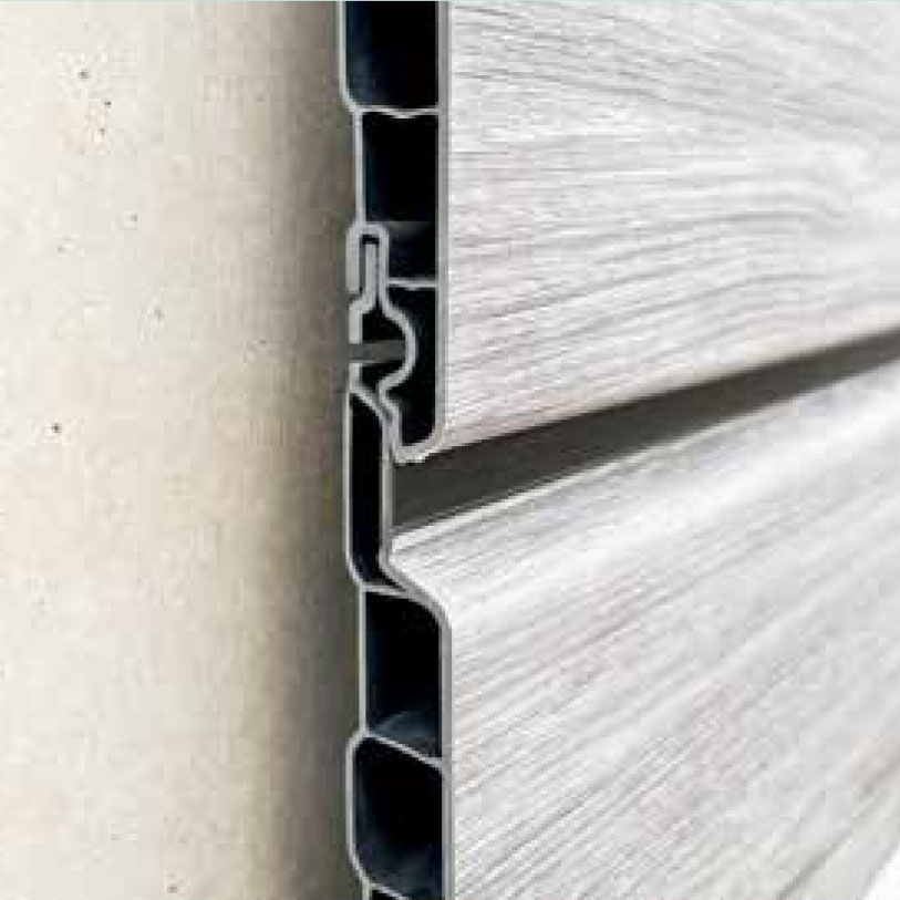 Pannello di rivestimento per esterni effetto perlinato con sistema di fissaggio con viti a scomparsa. Realizzato in materiale composito.